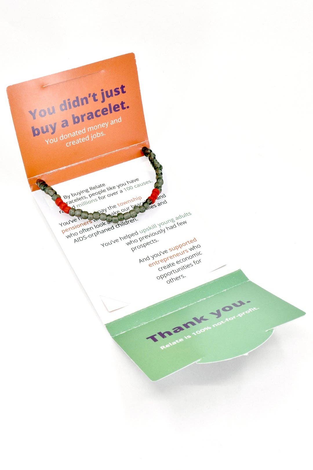 Relate bracelets are handmade and sold to make a difference and change lives. As a 100% not-for-profit social enterprise, the majority of Relate's revenue is donated to credible causes and invested in social initiatives, with a focus on creating opportunities for all involved, at every stage of a project.