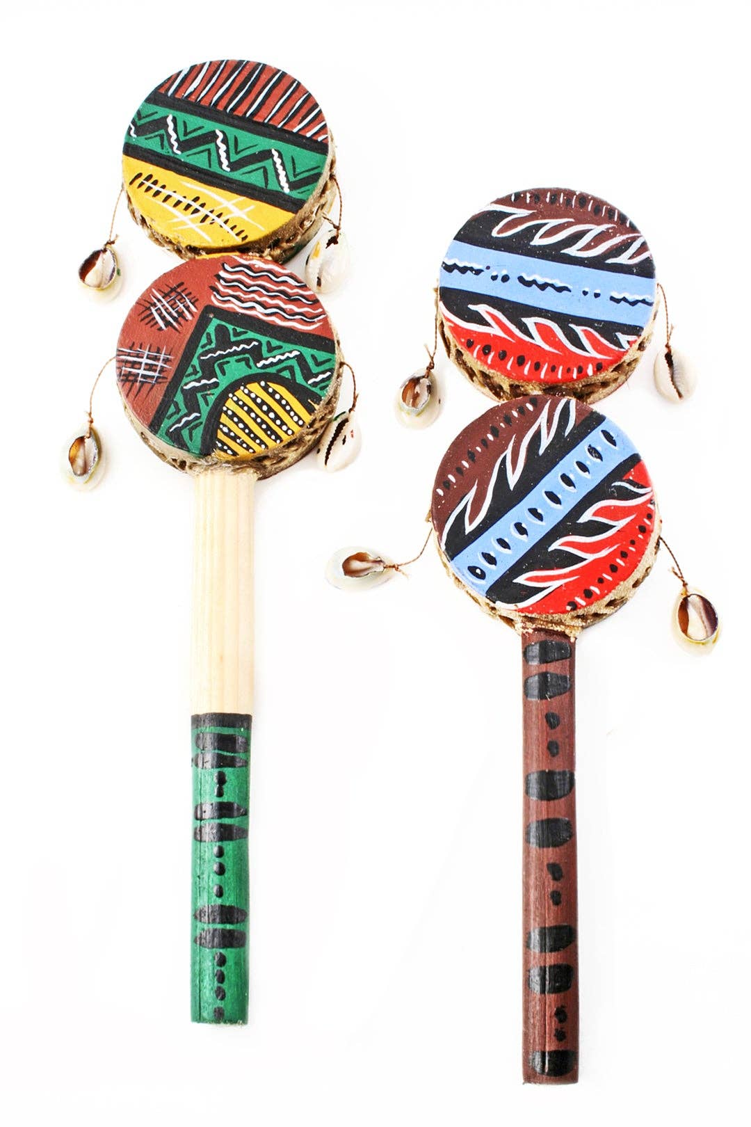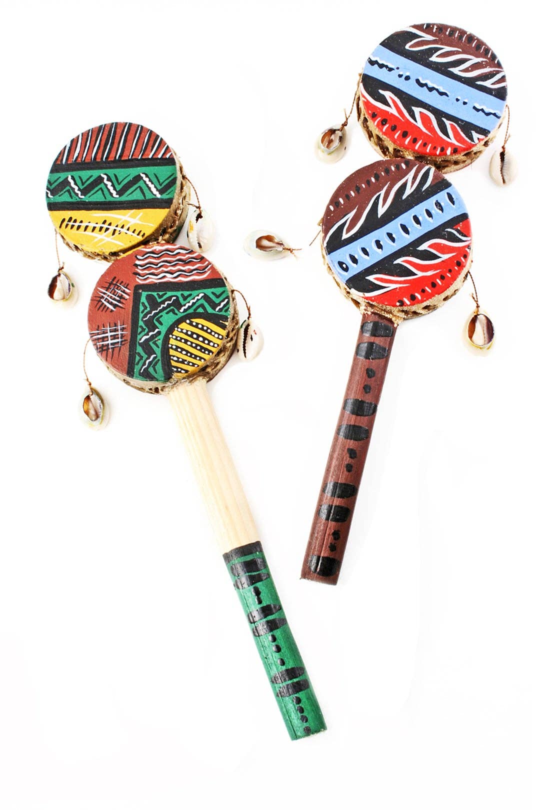 A small double spin drum handcrafted from stretched animal skin and wood. Painted designs add a splash of color.