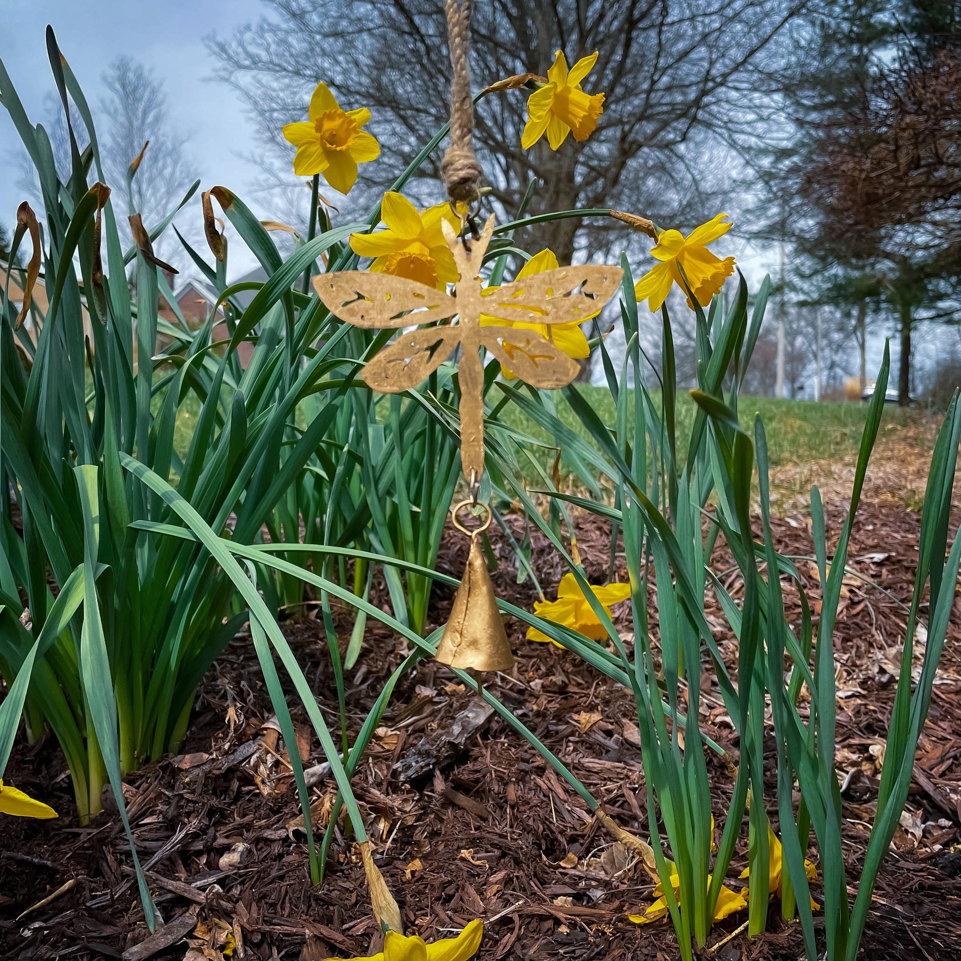 Our mini dragonfly chime is one of our newest addition to the mini chime family. It features a beautiful dragonfly with delicate cut-out designs on its wings and a cone-shaped bell at the bottom. The chime hangs on a jute thread and has an antiqued gold finish. If using outdoors we recommend spraying with a clear coat to prevent rusting.