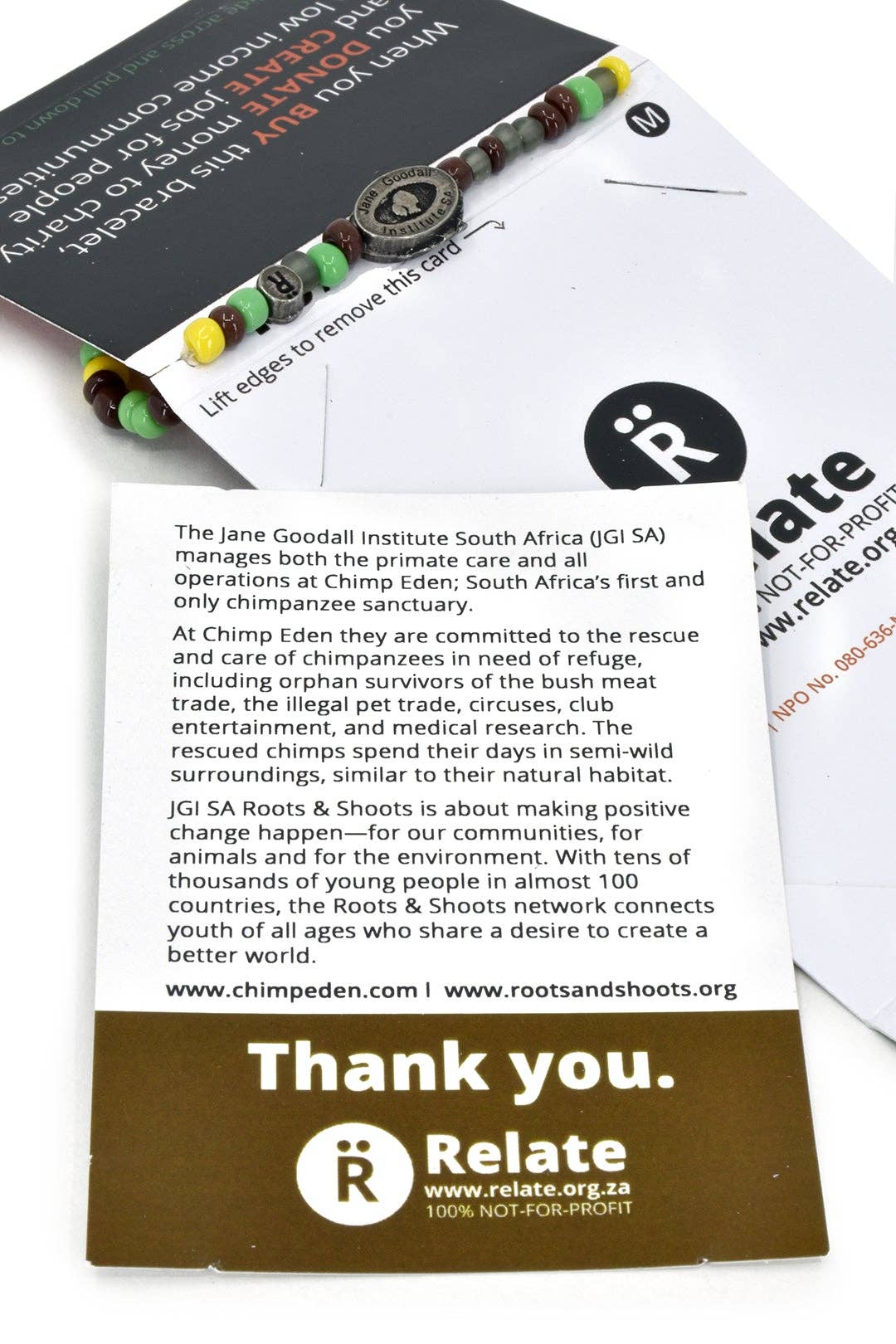 Through the sale of We're Ape About Chimpanzees bracelets, Relate has raised more than $23,000USD to support the Jane Goodall Institute. Each bracelet is handcrafted in South Africa, and includes an informative display card to promote awareness for Chimp Eden.